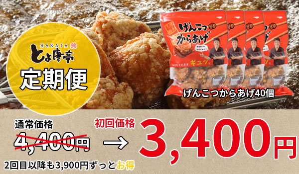 げんこつからあげ40個(10個入り×4)通常販売価格4,400円のところ、定期購入初回特別価格「3,400円」、2回目以降「3,900円」と通常よりお求めやすくなっております。